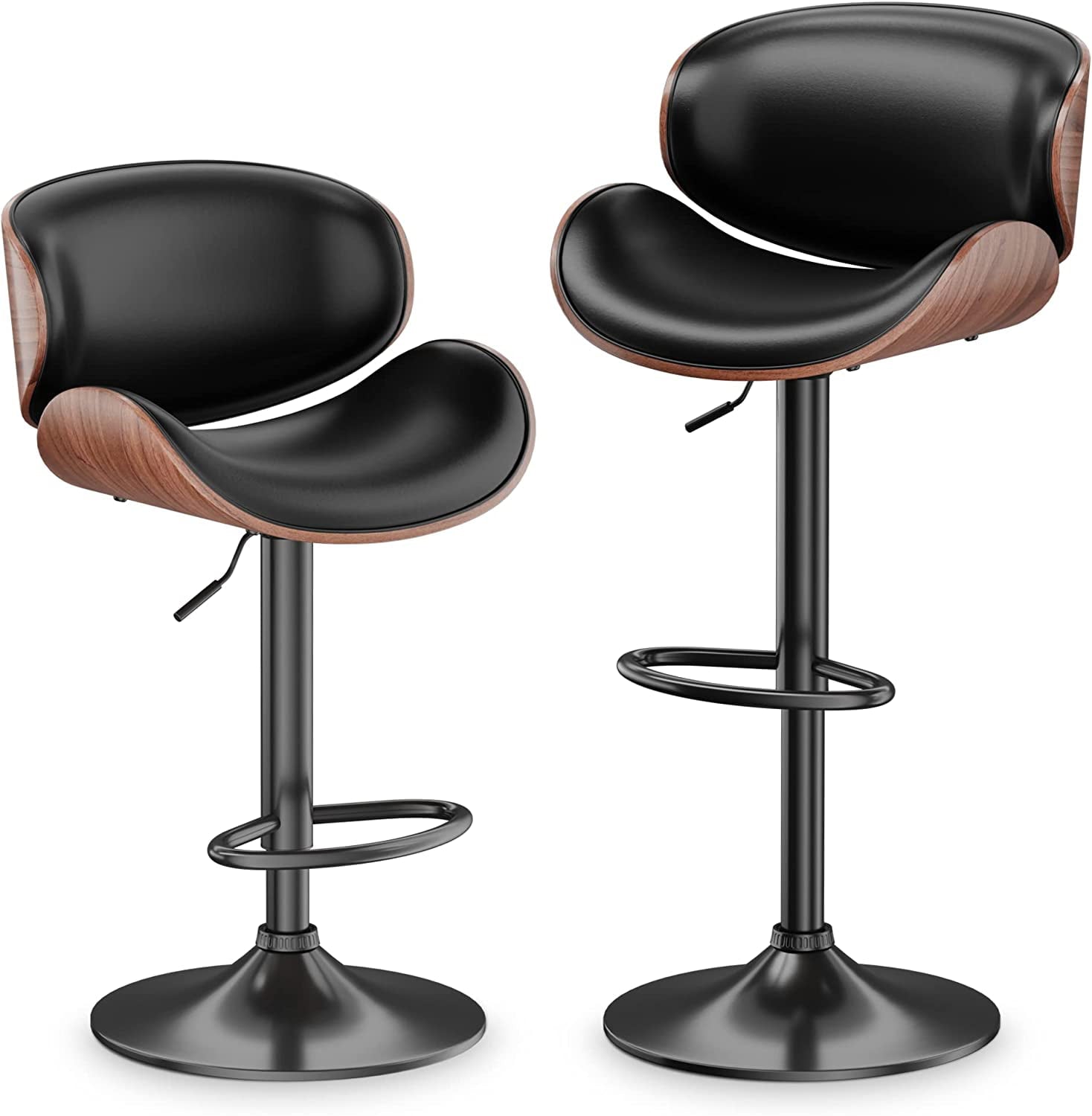 Aowos Bar Stool Adjustable Swivel Bar Stools Set of 2, Mid-Century Modern PU Leather Upholstered Counter Barstools, Kitchen Island Chair with Back Set of 2, Black
