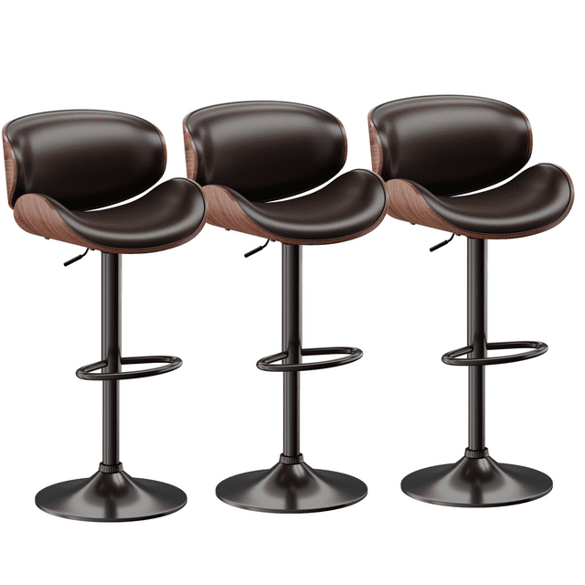 Aowos Bar Stools Set of 3 Adjustable Swivel Bar Stools, Mid-Century Modern PU Leather Upholstered Counter Barstools, Kitchen Island Chair with Back, Brown