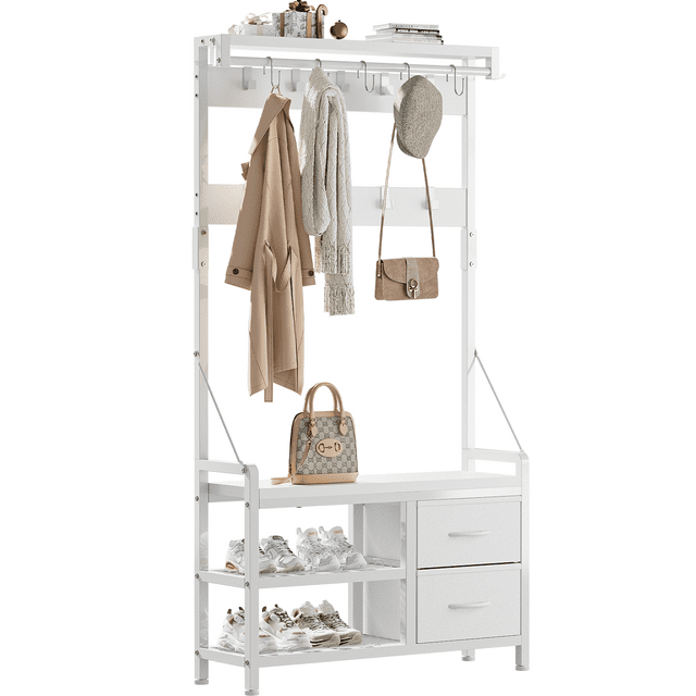 Organize Your Entryway Simplify Your Life - with Our 4-in-1 Hall Tree! Walking into your home to see clothes and bags scattered everywhere and no dedicated space for your shoes can be a major stressor. But don't worry, we have the perfect solution! Our 4-in-1 entryway rack has 17 movable hooks and features a shoe bench capable of holding up to 275 pounds, two shoe racks, and two drawers. This storage bench with coat rack can not only tidy up your entryway but can also be customized to fit your specific needs and space. Our coat storage is both stylish and durable, and will seamlessly blend with any home decor. Make the small hall tree a part of your home today and experience the convenience and comfort it brings!