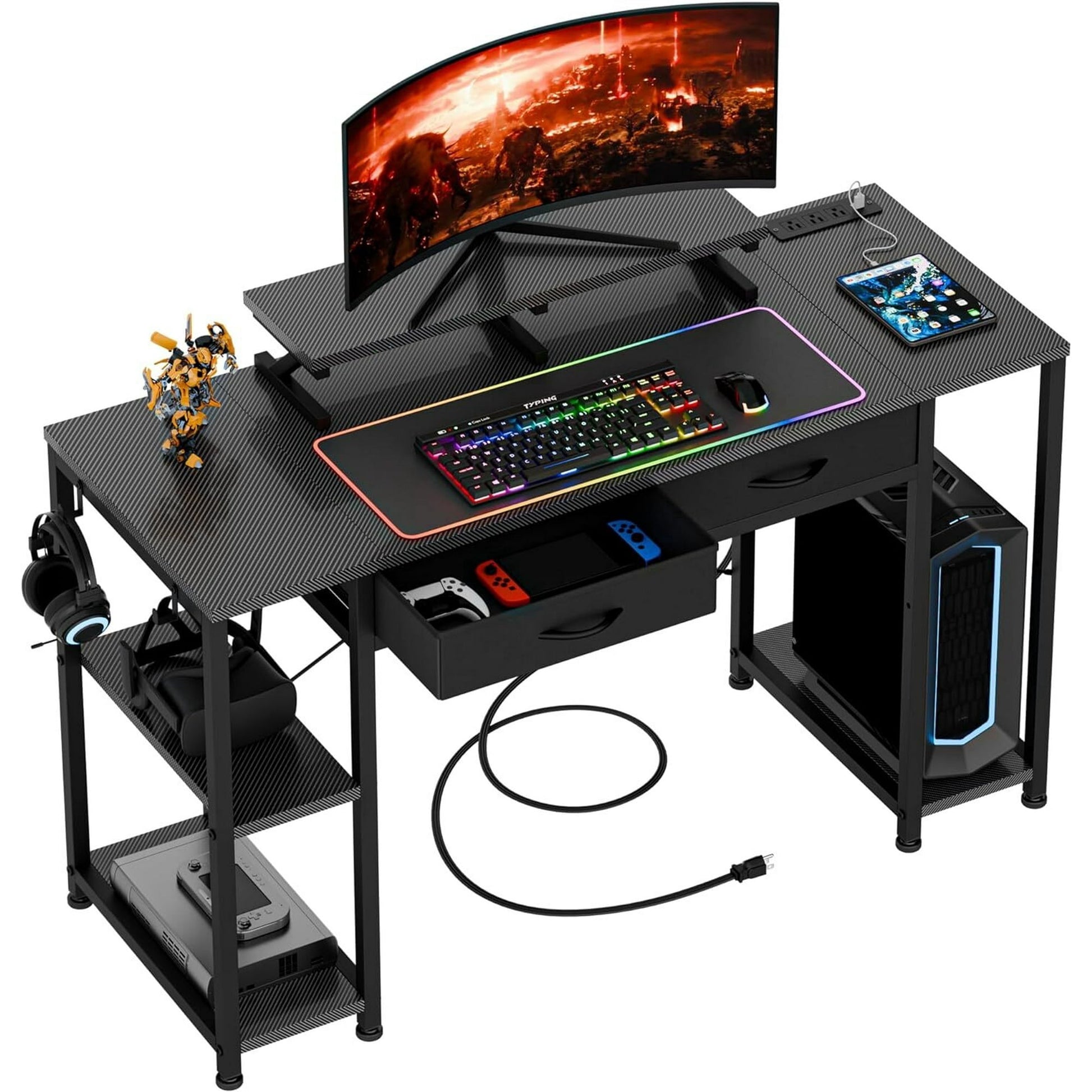My husband and I both enjoy gaming, so after our move, we bought two desks-one in carbon fiber for me and one in black for him. We both love the RGB lighting, and the desk has a power outlet for charging phones and laptops. It would be better if the monitor stand were a bit wider; it's just enough for a laptop, but typing can make the keyboard feel a bit awkward.