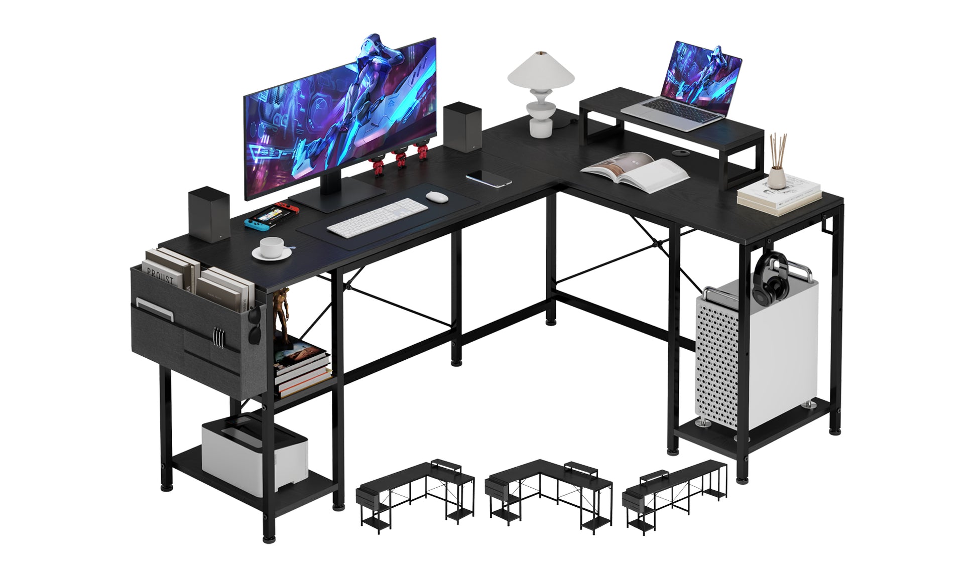 GIKPAL 59 Inch L Shaped Desk, Reversible Computer Desk with Monitor Stand, Office Desk with 3 Shelves and Storage Shelf, Home Office Desk, Black