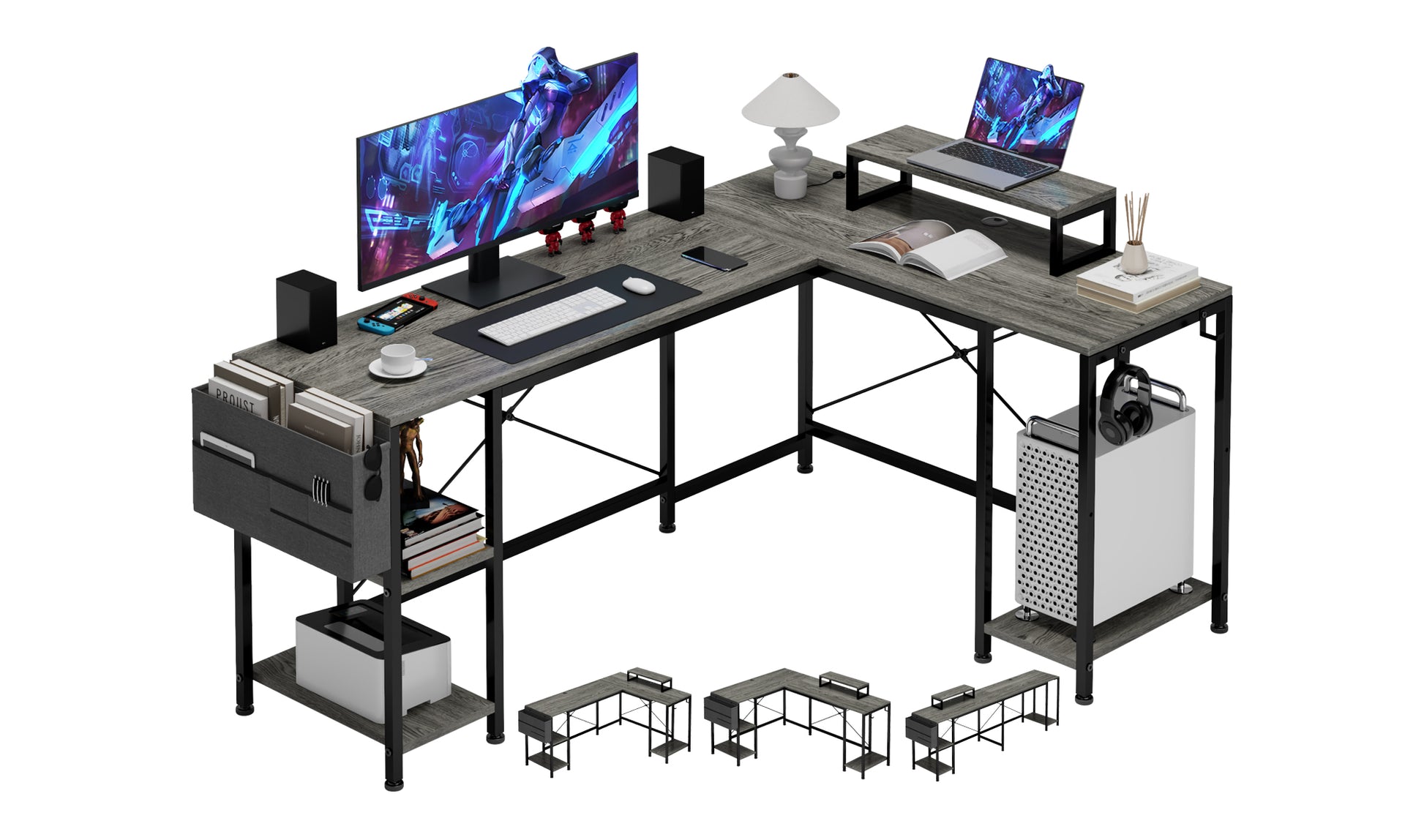 GIKPAL 59 Inch L Shaped Desk with Reversible Monitor Stand, Computer Desk with 3 Shelves and Storage Shelf, Home Office Desk, Corner Desk, Grey