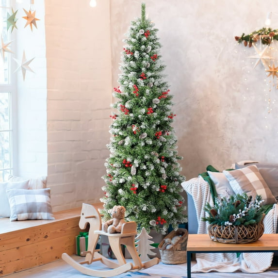 GIKPAL 6ft Pre-Lit Pencil Christmas Tree, Skinny Spruce Slim Holiday Decoration w/ 600 Tips, 200 Incandescent Lights, Metal Hinges & Base