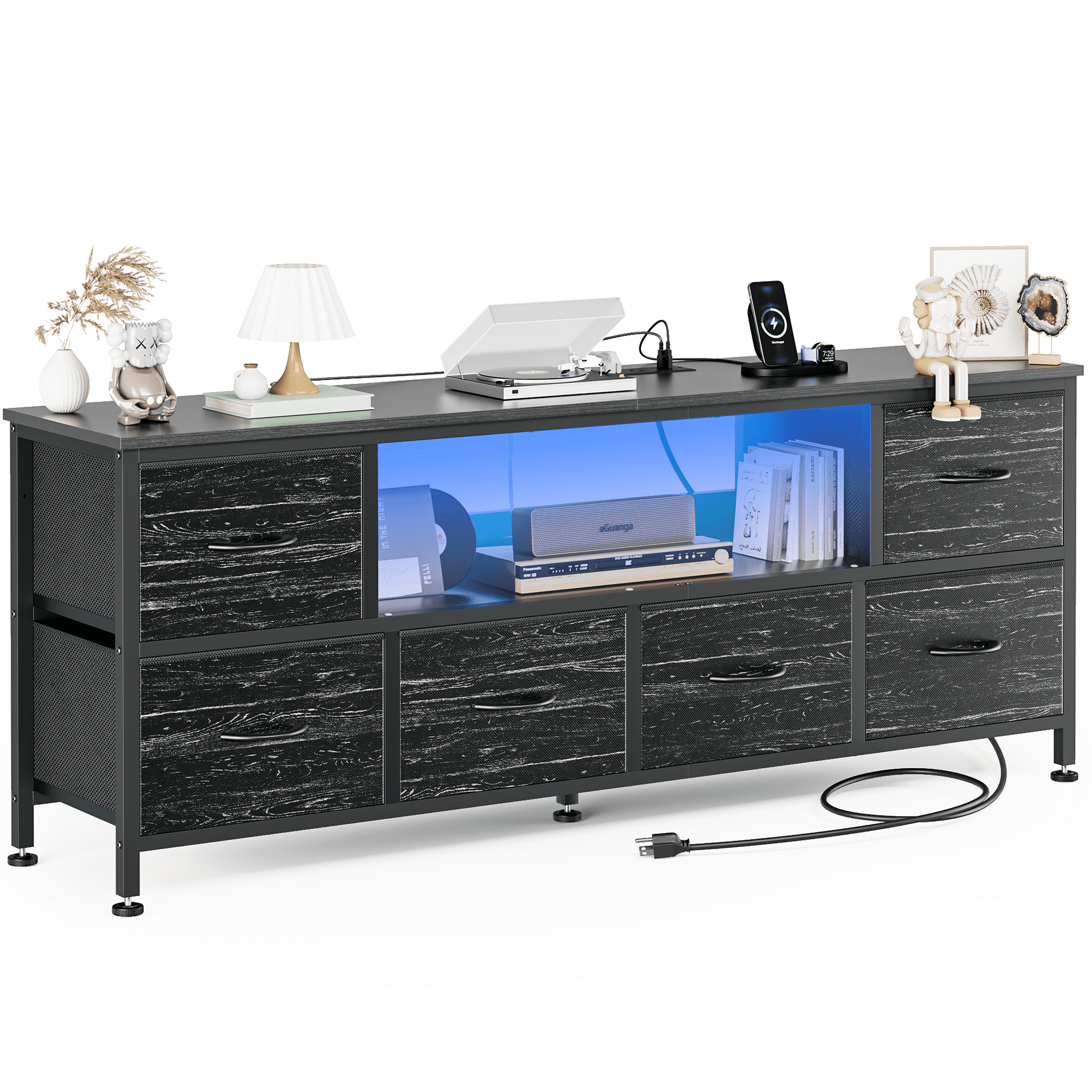 Finally got my bedroom looking polished with this elegant dresser. Those black fabric drawers fit right in with my decor, and the wood top is solid for my TV. Loving the built-in outlets and LED lights-super convenient and just adds to the overall vibe.