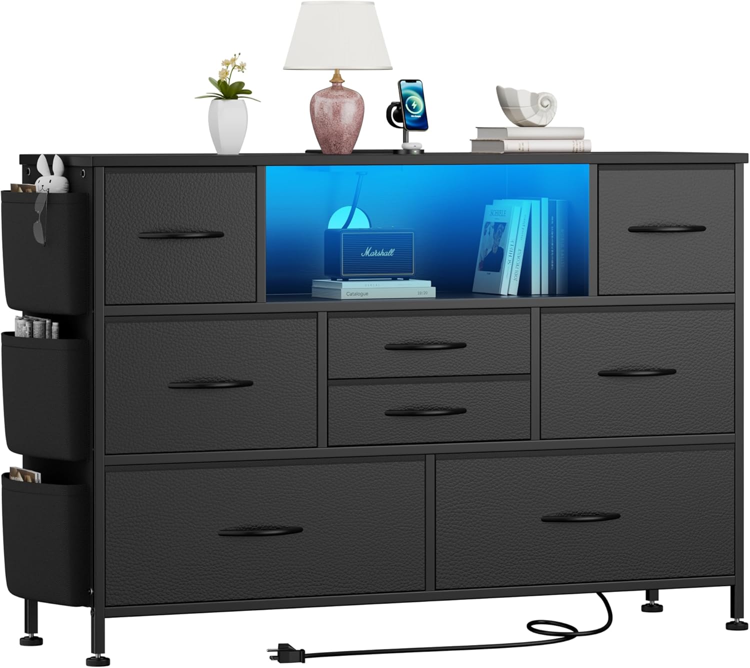 GIKPAL Black Dresser, Dressers for bedroom TV Stand with 8 Drawers and LED Lights, Wide Chest of Drawers with Power Outlet & Side Pockets Bedroom Furniture