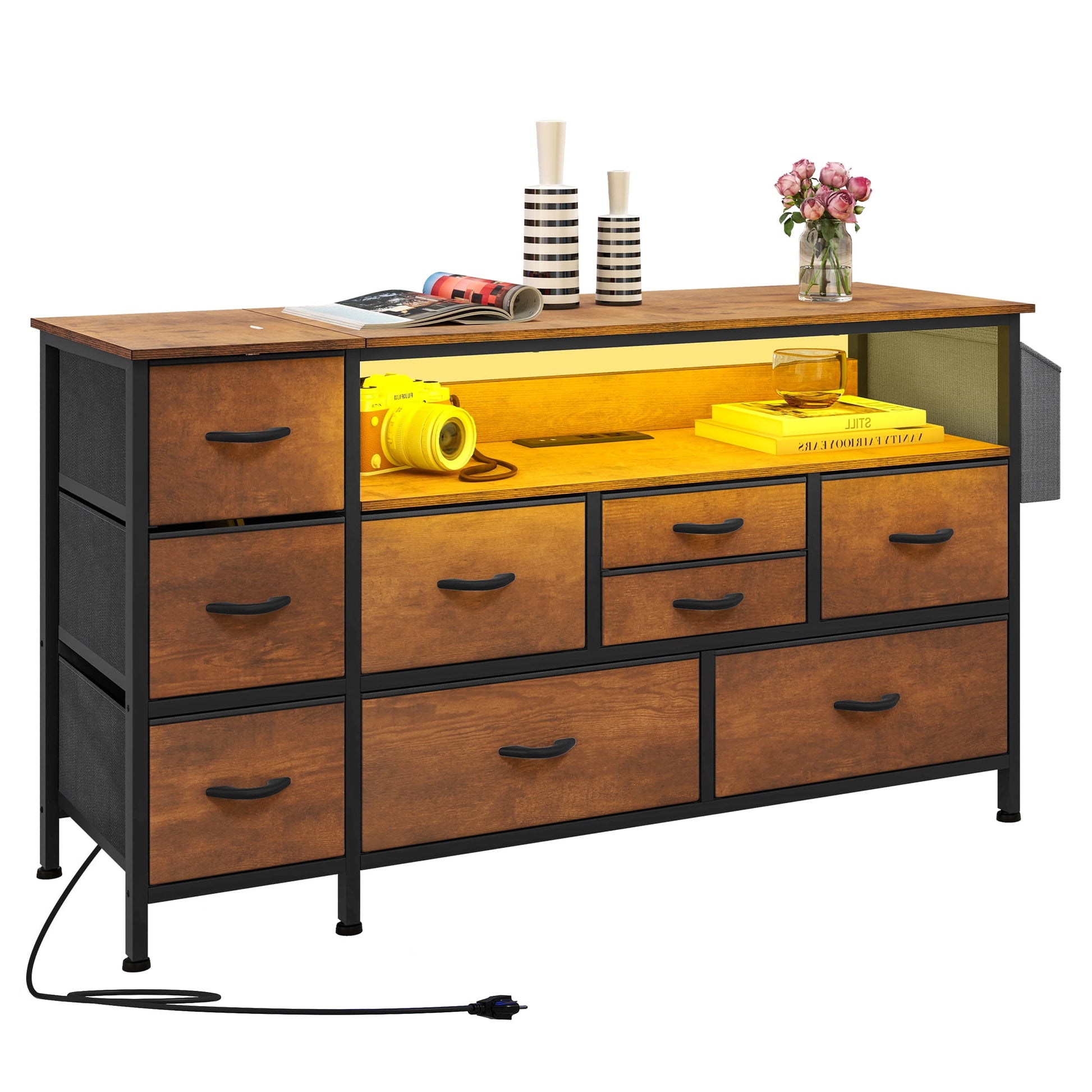 Finally got my bedroom looking polished with this elegant dresser. Those black fabric drawers fit right in with my decor, and the wood top is solid for my TV. Loving the built-in outlets and LED lights-super convenient and just adds to the overall vibe.
