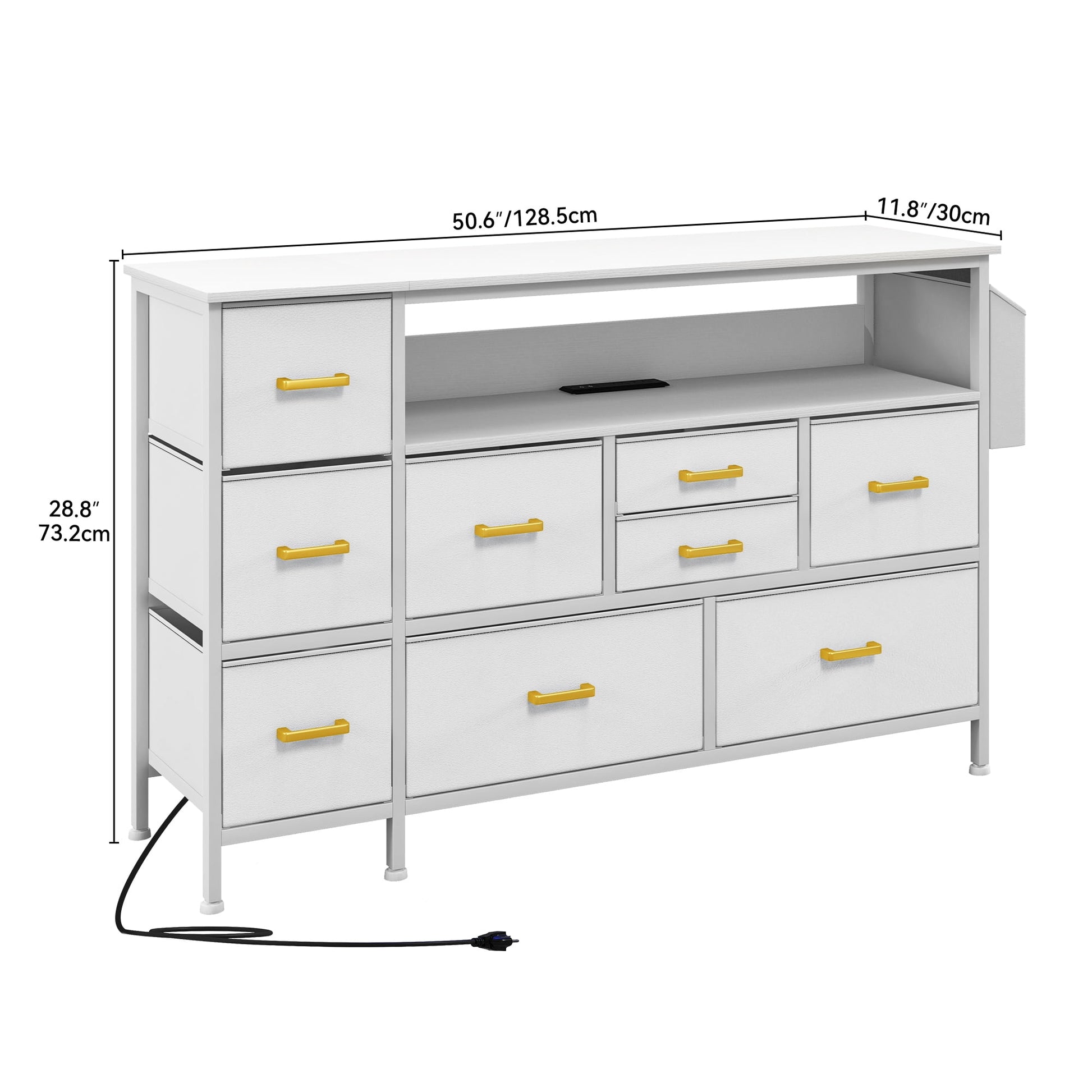 Finally got my bedroom looking polished with this elegant dresser. Those black fabric drawers fit right in with my decor, and the wood top is solid for my TV. Loving the built-in outlets and LED lights-super convenient and just adds to the overall vibe.